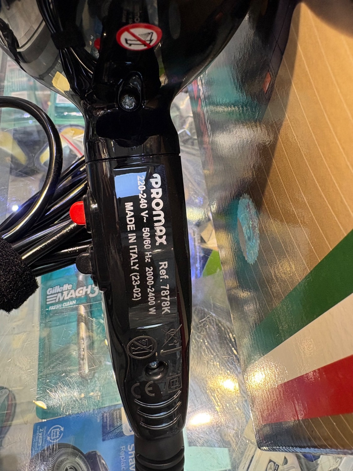 سشوار پرومکس ۷۸۷۸K با موتور AC ۲۴۰۰ وات، دکمه کراتین، فناوری یون منفی، تورمالین، ۳ حالت دما و سرعت، همراه با دو نازل متمرکز — مناسب برای آرایشگاه و استفاده حرفهای.